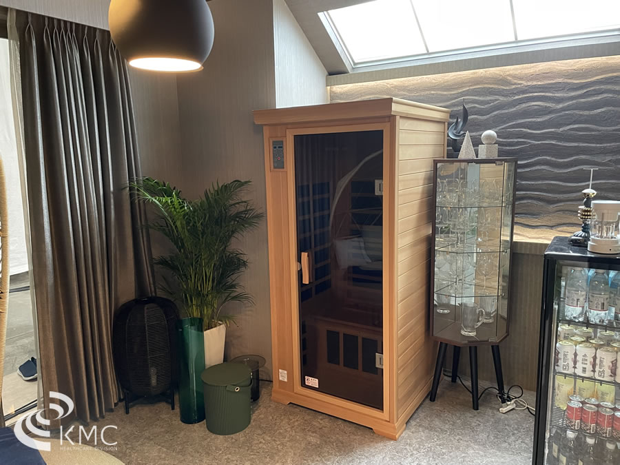 大型ガラスドアの遠赤外線サウナは弊社が最も得意とするサウナです。ガラスドアの場合、ドアを圧着させと割れる又は歪む可能性が高くなる為、戸当たりがありません。戸当たりが無いと行くことは隙間ができます。遠赤外サウナの場合、温度は中低温ですので隙間が空気の入れ替えの役割にもなるのです。