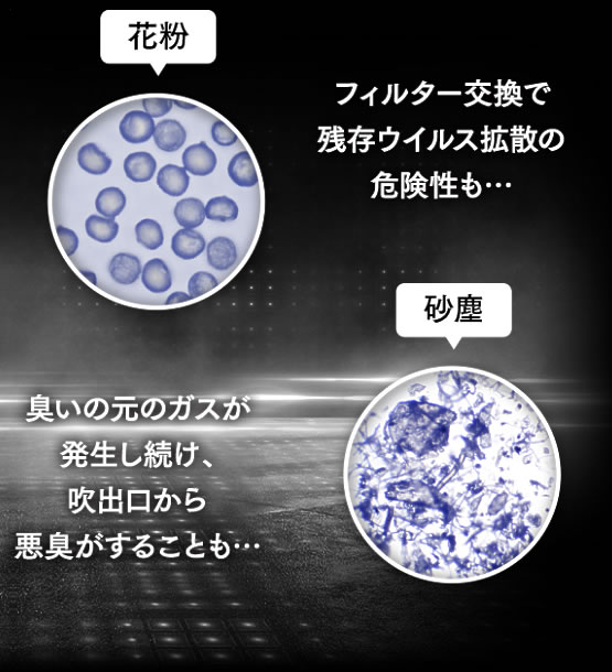 フィルターに菌やウイルス、臭いとなるガス成分を「吸着」させるのみで、菌やウイルスはフィルター上で生きた状態です。